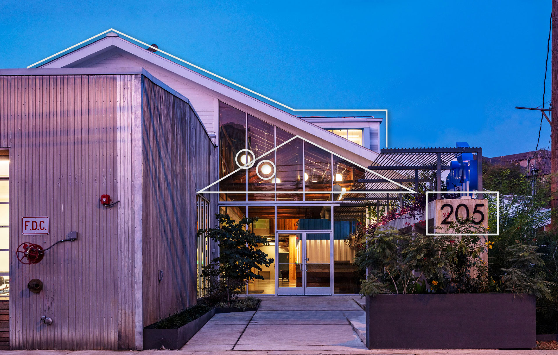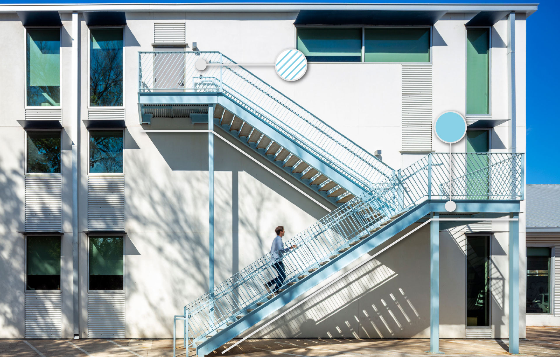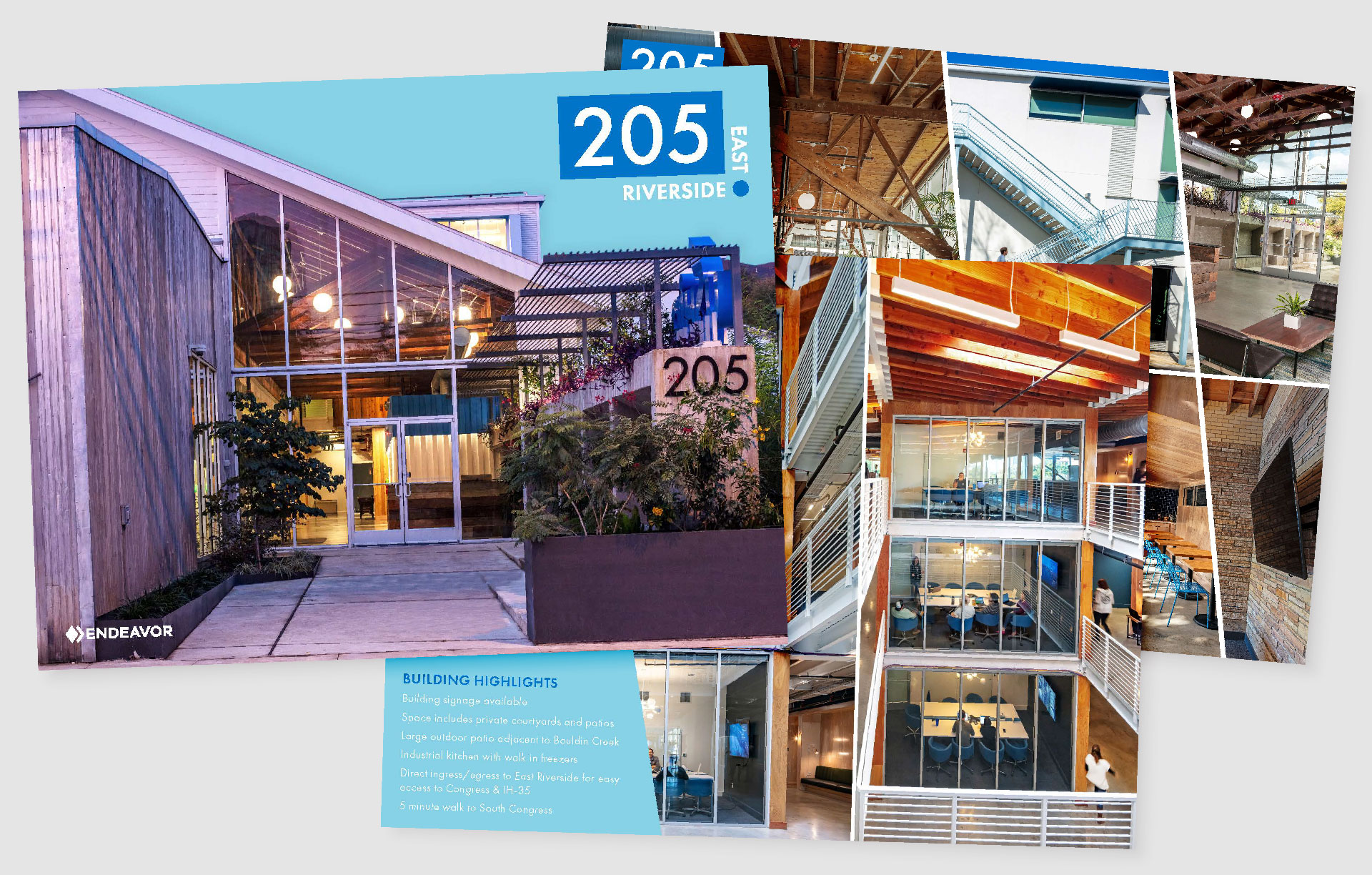 This creative office building located on East Riverside Dr isn’t your typical Austin Highrise office building. It’s small, unique, curated – and it needs marketing materials to match that. In the gallery below, I’ve highlighted aspects of the building that inspired its branding. First, I needed to match the font used on the exterior building numbers that had been done before our company became involved. Consistency is key, and if a font has already been used for the exterior of the building, carrying that through is important. Then I identified aspects of the architecture that could be mirrored in the design – from its slanted lines, triangles, and circles to the colors incorporated in the buildout. All of these features influenced the logo design, and then carried through the brochure.